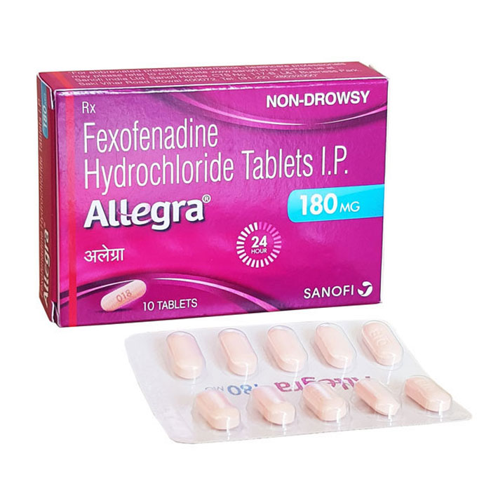 Allegra 180 mg (Fexofenadine) Tablet refers to a group of medicines named antihistamines. It uses various allergic conditions such as hay fever, conjunctivitis, and some skin reactions such as eczema, hives, and responses to bites and stings. It helps with watery eyes, runny nose, sneezing, and itching.
