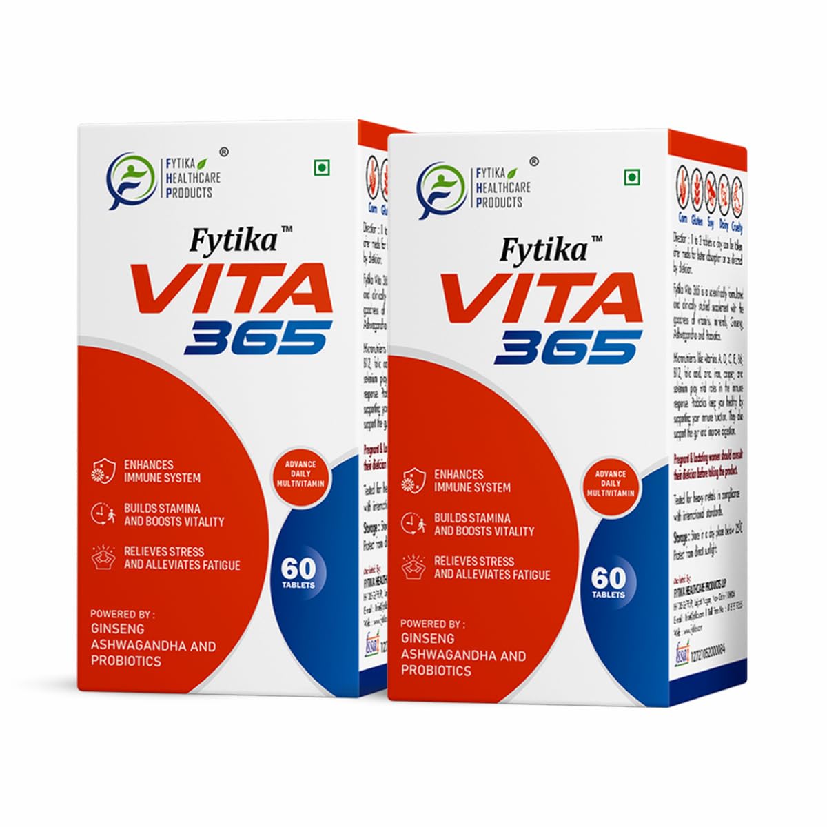 Fytika VITA 365 Tablet is a dietary supplement formulated with antioxidants, vitamins, minerals and essential herbs that strengthen the immune system. It helps to improve stamina, energy and vitality. It also relieves stress and anxiety levels and alleviates fatigue. It contains grape seed extract, vitamins, biotin and folic acid that protects from health-related concerns and maintains overall health.