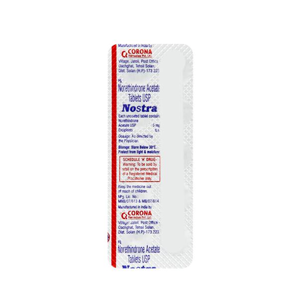 Nostra Tablet is used to treat various menstrual problems including painful, heavy, or irregular periods, premenstrual syndrome (PMS), and a condition called endometriosis. It is a man-made version of the natural female sex hormone progesterone.