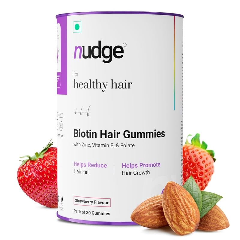 Our delicious strawberry-flavored gummies are specially formulated to promote healthy hair growth and prevent hair loss. Biotin, also known as vitamin H, is a key ingredient that helps improve the structure of keratin, the protein that makes up hair. Nudge Biotin hair gummies also contain Zinc, an essential mineral that helps maintain healthy hair follicles and prevents hair breakage. Vitamin E, a powerful antioxidant, promotes a healthy scalp by reducing inflammation and protecting against oxidative stress. Lastly, Folate, or vitamin B9, helps your body produce healthy red blood cells, which in turn supports healthy hair growth. Not only are our Biotin Hair Gummies effective, but they’re also easy and convenient to use. Simply take 1 gummy daily, post meals.Key Ingredients: