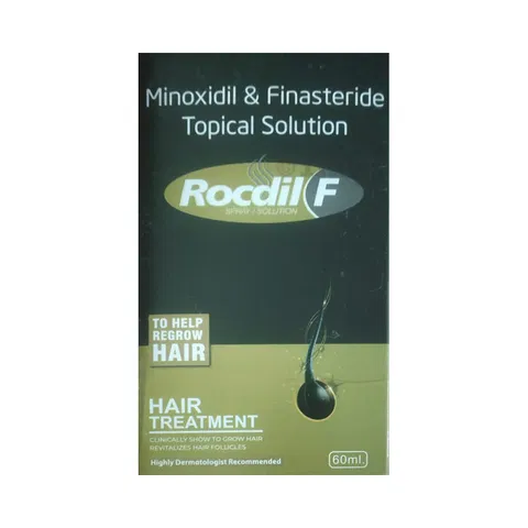 Rocdil F Solution is a medicine used to treat common hereditary hair loss in men. It prevents further hair loss and helps hair to regrow. It increases blood flow to the hair follicles on your scalp, which prevents hair cell death and also enhances new hair growth. It also stops production of a hormone that causes excessive hair fall or baldness and also increases hair growth. It is most effective for baldness or thinning at the top of the scalp but less effective at the front or for receding hairline. Benefits are less likely if you have been bald for many years or have a large area of hair loss.